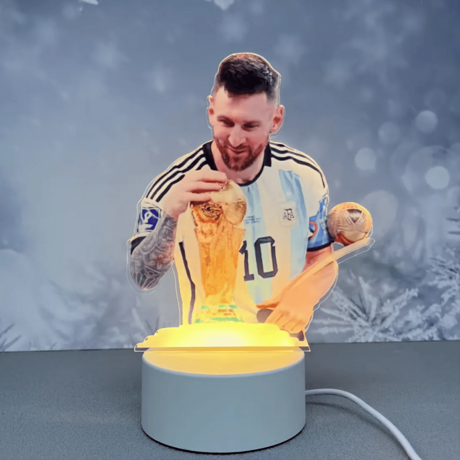 Celebrate the magic of Lionel Messi with this 3D acrylic night light. Featuring an illuminated silhouette of the football legend holding the World Cup trophy, this lamp is a must-have for any Messi fan. The warm LED glow brings this iconic moment to life, making it a perfect decorative piece for bedrooms, game rooms, or kids’ spaces.